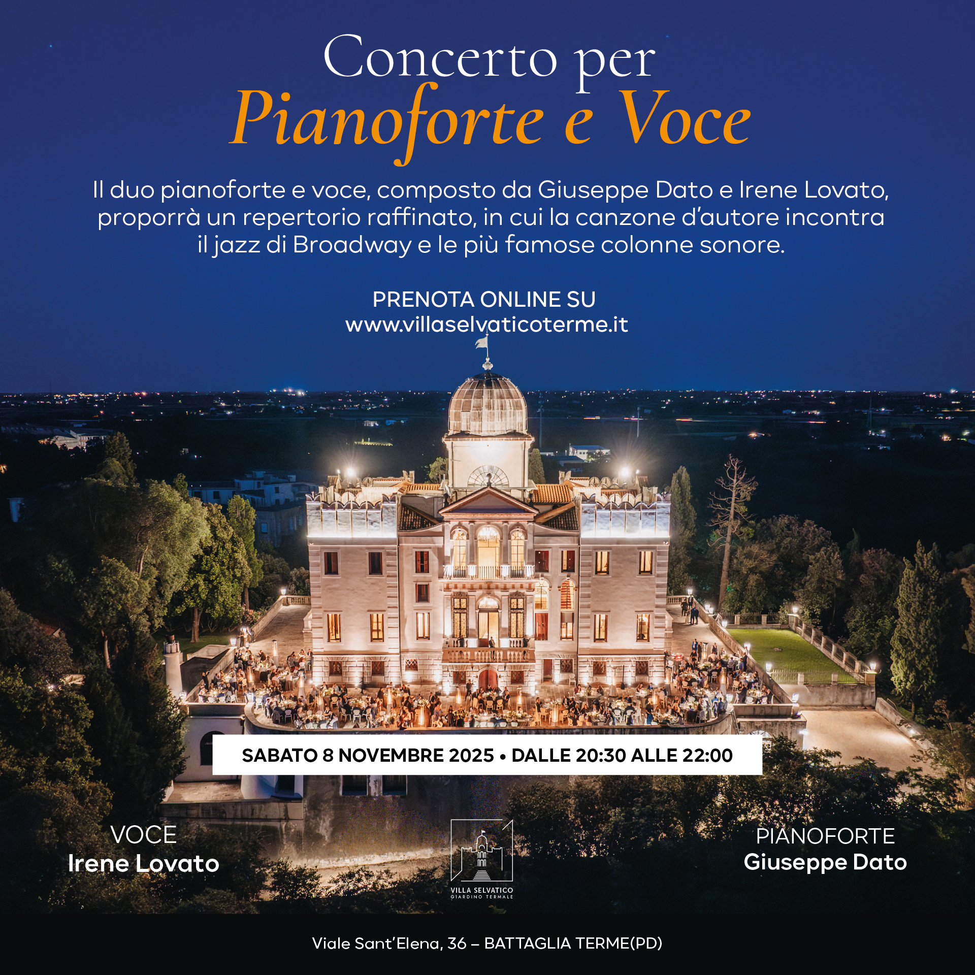 Villa Selvatico Viale Sant'Elena, 36, Battaglia Terme, ItaliaGiorni Ore Minuti Secondi Ottieni i biglietti Nel salone affrescato al primo piano nobile di Villa Selvatico, un concerto di pianoforte con Giuseppe Dato e la voce di Irene Lovato20:30 - Apertura cancelli e brindisi di benvenuto21:00 - Inizio concerto22:00 - Termine concertoPrenotazione Obbligatoria - Posti limitati • POSTI NON NUMERATI •Viale Sant'Elena, 36 - […]
