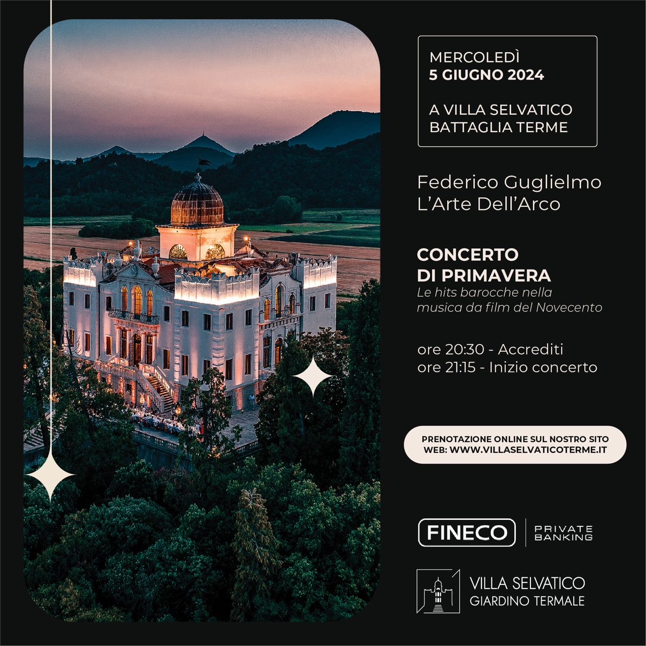 Villa Selvatico Viale Sant'Elena, 36, Battaglia Terme, ItaliaVilla Selvatico in collaborazione con Fineco - Private Banking vi invita al concerto 𝗣𝗥𝗢𝗚𝗥𝗔𝗠𝗠𝗔: Le hits barocche nella musica da film del Novecento - Tomaso Albinoni (in realtà Remo Giazotto) Adagio per violino, archi e continuo - Johann Pachelbel Canone e Giga in re maggiore per 3 violini e continuo - Alessandro Marcello Concerto per […]