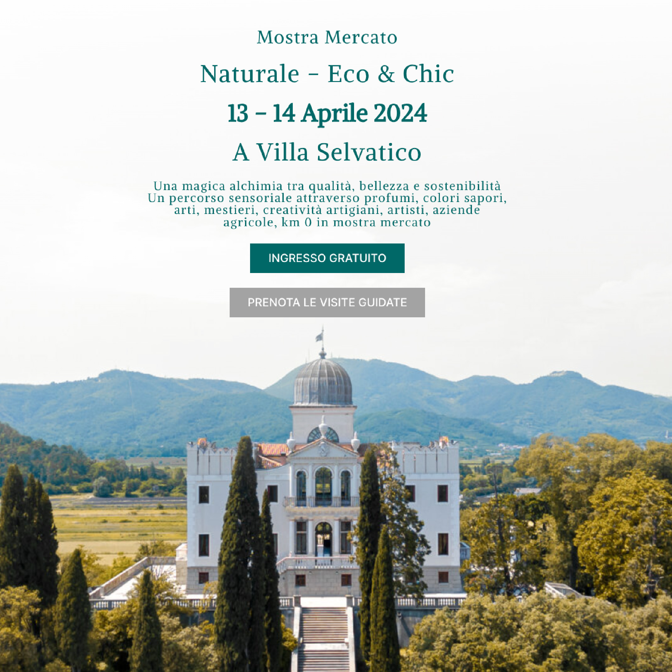 Villa Selvatico Viale Sant'Elena, 36, Battaglia Terme, ItaliaUna magica alchimia tra qualità, bellezza e sostenibilità Un percorso sensoriale attraverso profumi, colori sapori, arti, mestieri, creatività artigiani, artisti, aziende agricole, km 0 in mostra mercato